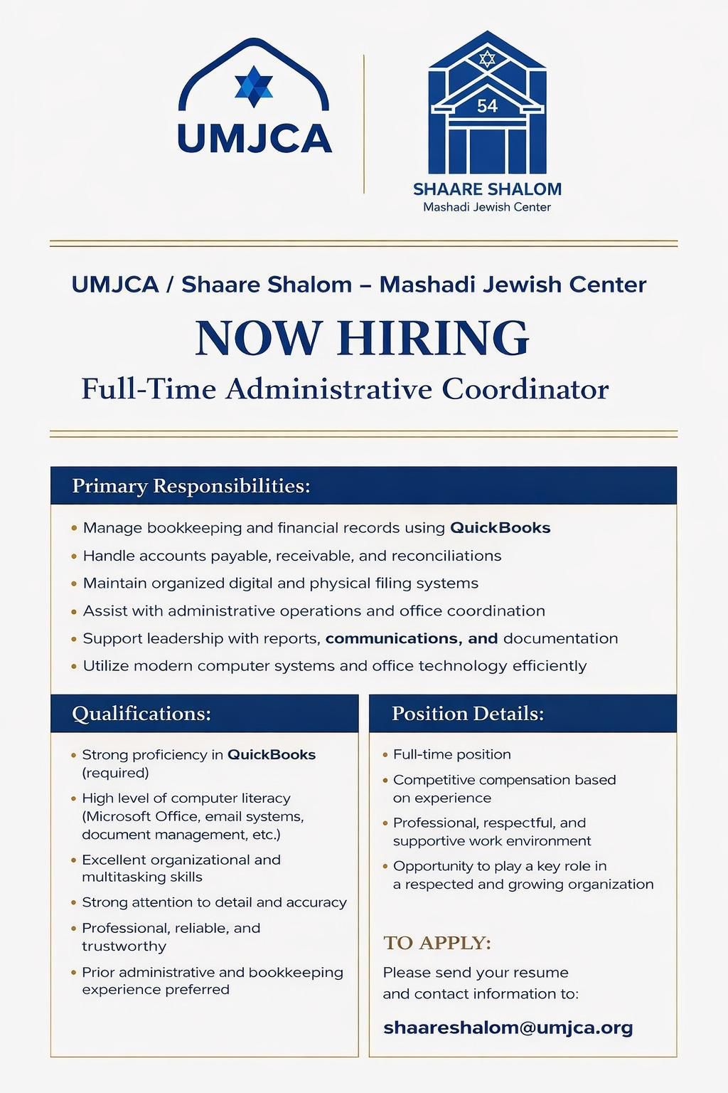 NOW HIRING! UMJCA / Shaare Shalom - Mashadi Jewish Center - NOW HIRING - Full-Time Administrative Coordinator CLICK HERE FOR FLYER AND MORE INFO
