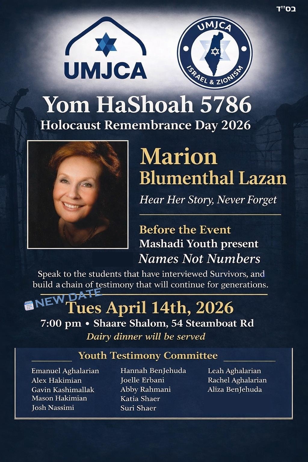 UMJCA Yom HaShoah Event - Tue, Apr 14 Guest Speaker Holocaust Survivor Marion Blumenthal Lazan. Before the event, Mashadi Youth present Names Not Numbers. Speak to the students that have interviewed Survivors, and build a chain of testimony that will continue for generations. Will be before the main speaker begin. NEW DATE (incorrect on HaChodesh): Tues April 14th, 2026 - 7:00 pm Shaare Shalom, 54 Steamboat Rd. Dairy dinner will be served. Contact Tony Aziz: (516) 423-1891 CLICK HERE FOR FLYER AND MORE INFO