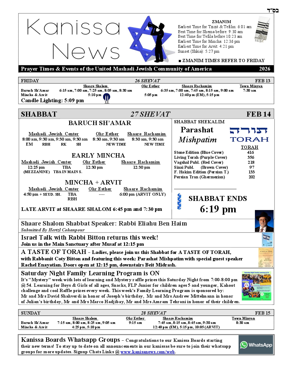 SHABBAT ENDS: 6:19 pm