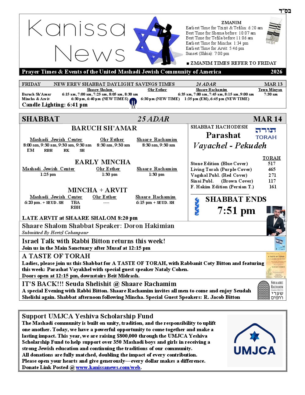 SHABBAT ENDS: 6:43 pm