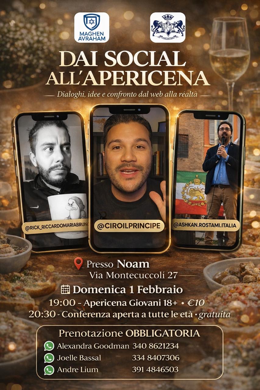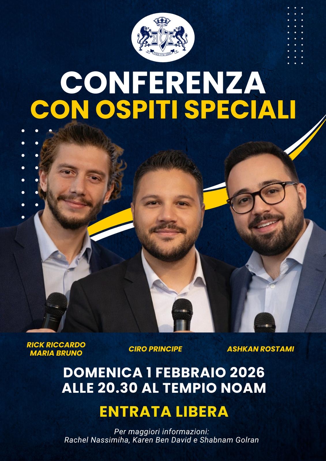 Il Tempio Noam, vi ricorda nuovamente l’appuntamento di Domenica 01 Febbraio, alle ore 20.30, in cui, ospiterà una Conferenza che avrà come relatori, Ospiti Speciali: Rick Riccardo Maria Bruno, Ciro Principe e Ashkan Rostami. L’entrata è libera. Per maggiori info, Sigg.re: Rachel Nassimiha, Karen Ben-David e Shabnam Golran. (Locandina in allegato).