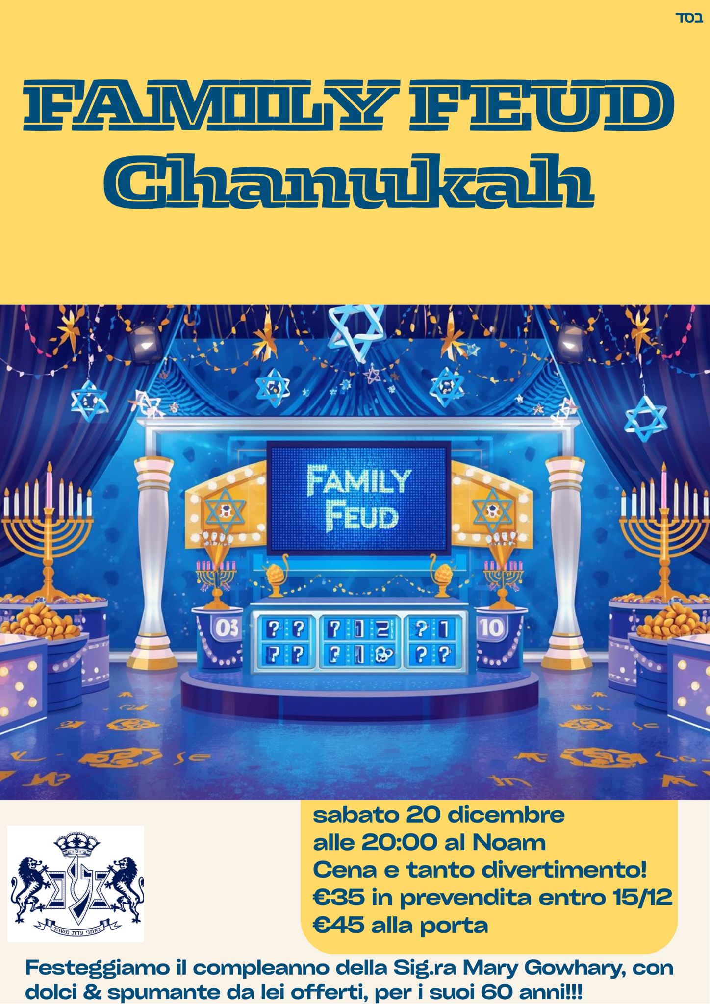 Informiamo tutto il cortese Kahal, del grande evento del “Family Feud Channukah” che si terrà Sabato sera 20 Dicembre, presso il Salone Noam, dalle ore 20.00, con Gioco, Cena & Divertimento assicurato!!